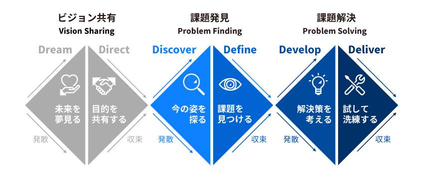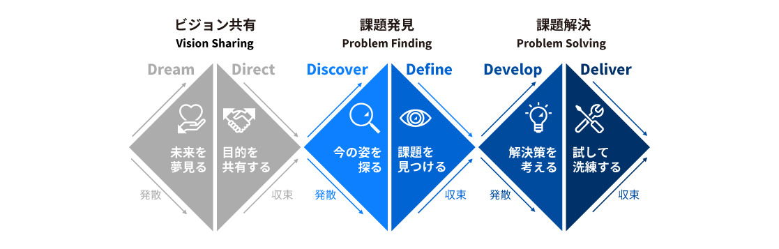 不確実性の⾼い世の中で新しい価値を⽣み出すには、従来のような問題を分析して論理的に解決するだけでなく、アイデアを試し、観察とフィードバックによって探索と適応を繰り返す「プロトタイプ思考」が有効です。具現化しながらアイデアを考えることで創造⼒が刺激され、考えているだけでは発想できないアイデアが創出できるようになります。