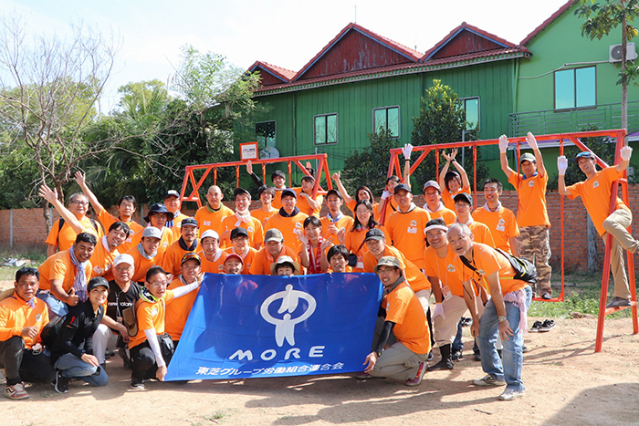 当社労働組合では、カンボジアの小学校で校庭へのブランコの設置や校舎・教室の壁塗装などの修繕を行うボランティア活動を行っています。その活動の一環として、ご家庭で不要となった文房具や遊具などを集め、現地の小学校や児童養護施設の子どもたちへ寄贈する活動を行っており、労使で社員への協力を呼びかけました。集まった文房具や遊具は、東芝グループ連合第21次カンボジアボランティア団により、現地の子どもたちに届けられました。
