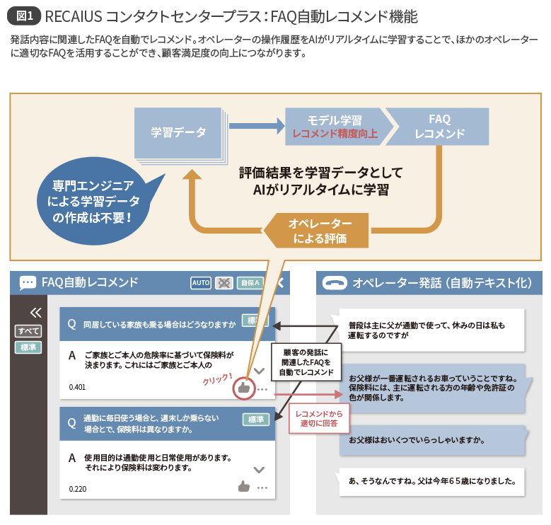 そこで当社は、高精度の音声認識技術に加えて、発話内容に応じたFAQをAIでレコメンドする技術と、オペレーターの発話や操作履歴からAIの学習データを抽出し、モデルの更新を自動で行う技術を開発。これにより、AIや分析のエンジニアに任せなくても、オペレーターやスーパーバイザー(各オペレーターのモニタリングや支援を行う管理者)がこのRECAIUS コンタクトセンタープラスの利用を重ねることで、FAQのレコメンド精度が自動的に向上していきます。FAQのレコメンド精度が上がれば、新人のオペレーターでもベテランオペレーターのように適切に素早くFAQを活用することができるようになります(図1)。