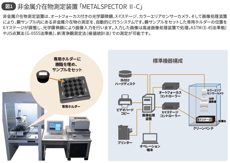 METALSPECTORⅡ-Cは、鋼材の品質保証に関連する規格に準拠した各種測定法だけでなく、メーカー独自の測定法にも対応しています。当社独自の測定アルゴリズムとオートフォーカス機能を組み合わせ、ひとつのサンプルに対して、ASTM*法で約6分、JIS点算法で約2分と高速で、かつ、電子顕微鏡を使って目視で識別したときの介在物の幅や長さとの差異が±0.25µmという高精度な判定を可能にしました。また、数種類が存在する介在物、例えば硫化物介在物とそこに内在する酸化物介在物などを個別に抽出して識別できるなど、これまでにはなかった強力な画像処理を実現。現在、多くの品質検査の現場でご利用いただいています(図1)。
