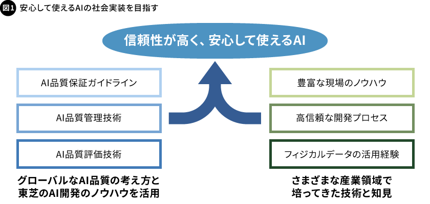 東芝は、こうしたAIの品質保証に関する国内外の動きを受け、AIに対する最新の品質保証の考え方と、自分たちがこれまでに培ってきた技術や知見を掛け合わせて、各産業分野に対して最適な形でAIの品質管理を行う仕組み作りに取り組んでいます。そこで目指しているのは、安心して使えるAIを社会に実装することです(図1)。