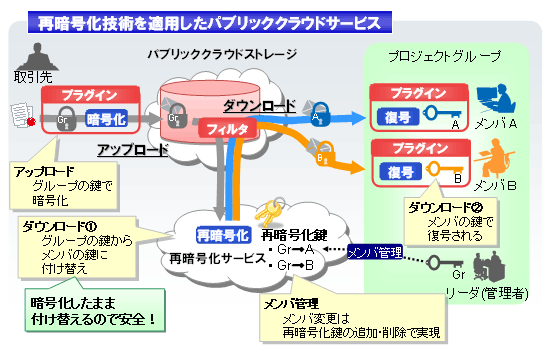 近年、クラウドが大きな注目を集めていますが、クラウド上に保管するデータの漏洩に対するユーザーの不安は大きく、これまではデータを暗号化して保管する等の対策が採られてきました。しかし、データ共有サービスのように、重要データをクラウドストレージに保管して共有する場合、共有メンバーの変更ごとに保管データを暗号化しなおす、鍵を再配布するなど、安全性や利便性に多くの課題がありました。