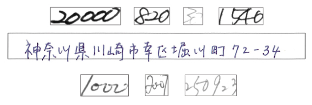 従来の「1文字単位」の文字認識から、ディープラーニングを活用した「複数文字単位」の文字認識にすることで、1文字単位への切り出しが難しい「接触文字」「枠線にかかった文字」「つづけ字」の認識精度を向上しました。(図1、図2) - ②