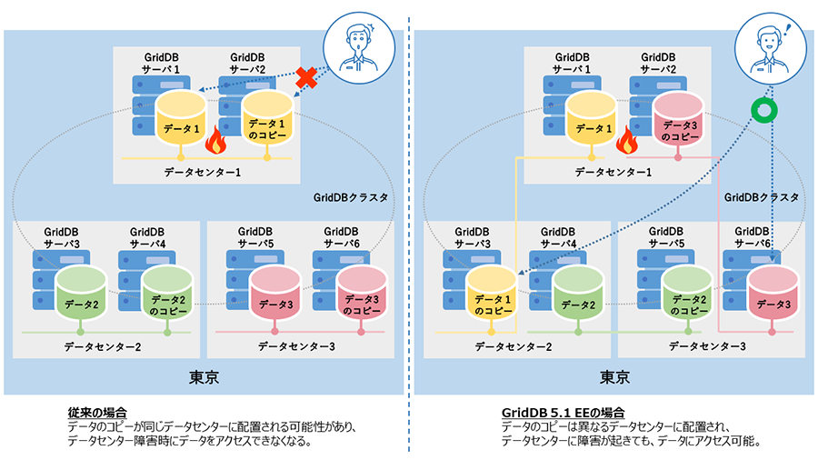 そこでGridDB 5.1 EEではデータコピー機能を強化し、コピーしたデータを異なるデータセンターに配置するようにしました。本機能によって、データセンターの障害や災害の発生時でもデータの処理を継続して行うことが可能になります。