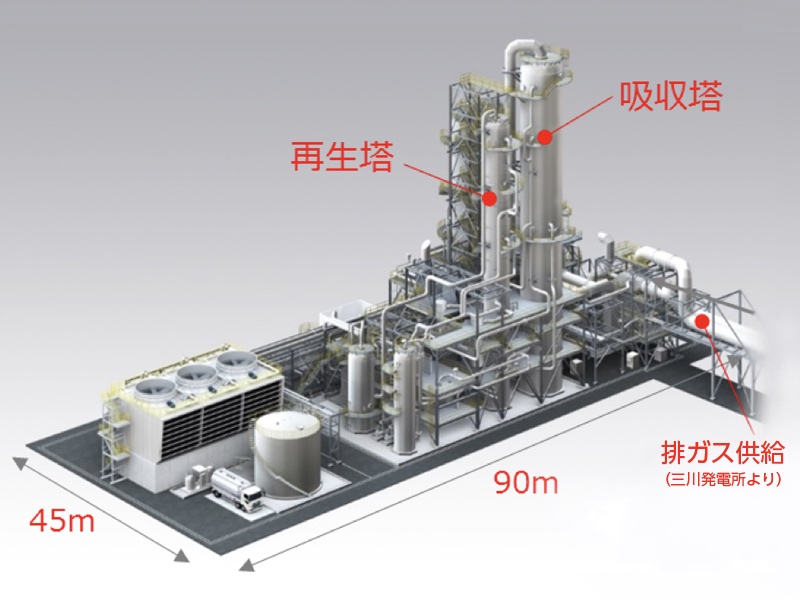 東芝では、2009年以来、グループ会社である株式会社シグマパワー有明の三川発電所(福岡県大牟田市、50MW)内にCO₂分離回収設備のパイロットプラントを建設し、実際の発電所の排出ガスからCO₂を分離回収する設備の開発・改良・実証を積み重ね、検証を進めてきた。