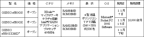 | Pocket PC 「GENIO e」の新シリーズの発売について 2002年10月31日