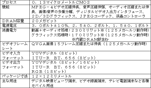 当社は、1998年に世界で初めてMPEG-4動画像処理LSIを発表して以来、主に携帯電話をターゲットとしたLSIのラインナップを発表してきました。近年、液晶の高精細化や高速データ通信の環境整備などに伴い、携帯電話などの高機能・高性能化が本格的に進展しています。また、携帯電話の多機能化において、高画質な動画像や、高精細な3Dグラフィック処理へのニーズが高まってきており、さらに機器の小型化も求められています。こうしたことから当社は、カメラやディスプレイ表示制御回路を1チップ化し、グラフィック機能を強化した新製品を商品化するものです。 本開発品の主な特長