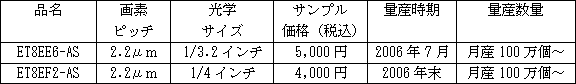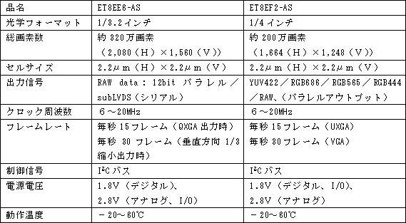 当社は、カメラ付携帯電話に代表されるモバイル機器や各種画像機器に搭載される 新製品は、いずれも画素ピッチを従来品の2.7μmから2.2μmへと大幅に微細化することにより、「ET8EE6-AS」では総画素数約320万画素で従来品の光学サイズ1/2.6インチから1/3.2インチへ、「ET8EF2-AS」では総画素数約200万画素で光学サイズ1/4インチという小型化をそれぞれ実現しています。また、いずれの製品もスミア*2レス、高速動作などのCMOSエリアイメージセンサとしての特長を有しており、カメラ付携帯電話をはじめとするモバイル機器に応用可能です。「ET8EF2-AS」は、ISP*3機能を内蔵しており、容易にカメラシステムの構築が可能です。 なお、これらの新製品は、10月3日から幕張メッセで開催するCEATEC JAPAN 2006にて展示する予定です。