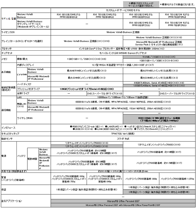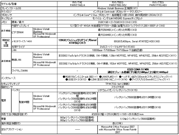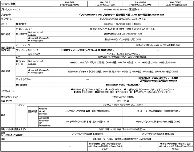 当社は、世界一軽い*2モバイルノートPCである「dynabook SS RX」シリーズにおいて、世界で初めて*1、128GBのフラッシュメモリドライブを搭載したモデルと、auのネットワークを利用した広域無線通信(ワイヤレスWAN)機能を搭載したモデルをラインアップに拡充し、店頭販売向けに3モデル、WEB販売向けに4モデル、企業向けに60モデル、合計67モデルを3月25日から順次発売します。 「dynabook SS RX」シリーズは、“true mobility”をコンセプトとして、長時間のバッテリ駆動、ボディの堅牢性、豊富なインタフェースを搭載した高い拡張性など、モバイルノートPCに必要なさまざまな機能を、最薄部19.5mm(最厚部25.5mm)というスリムボディの中で実現した世界で一番軽い*2モバイルノートPCです。 このRXシリーズにおいて、当社が開発した大容量フラッシュメモリドライブを採用し、世界で初めて従来機種*3の2倍にあたる128GBを搭載したモデルを発売します。一つの素子あたり2ビットのデータを保存できる多値NAND技術により、搭載しているフラッシュメモリドライブ自体の大きさは従来のものとほぼ変わらないため、RXシリーズの特長である世界最軽量のスリムボディをそのまま継承しています。さらに、フラッシュメモリドライブの長所である耐振動、耐衝撃性能と、RXシリーズの特長であるスリムで堅牢性の高いボディとの組み合わせで、お客様はより手軽に、安心・安全に持ち歩くことができます。 また、広域無線通信(ワイヤレスWAN)機能を搭載したモデルは、 KDDI CDMA 1X WIN*4通信モジュールを内蔵し、日本全国をカバーする*5auのネットワークを利用した高速データ通信が可能です。有線LANや無線LANの環境がなくても、全国どこでも*6いつでもインターネット通信が利用できます。しかもPC対応のデータ通信定額プランにより、ローコストで常時接続環境を構築することができます。さらにアンテナには当社独自のマルチバンドアンテナ実装技術を採用し、PC本体へアンテナを内蔵するとともに高感度の無線通信を実現しています。本モデルは通信モジュールやアンテナの内蔵により、本体の外部に通信カードやアンテナ部が出っ張らないため、PC本体の携帯性を損なわず、同時に外的損傷などのトラブルの発生も軽減することができます。 当社は、本モデルで“true mobility”の具現化をさらに推し進め、実現しました。今後も 「dynabook SS RX」シリーズにおいて、お客様のさまざまなご要望を当社の技術により実現し、ご満足いただける高いモビリティ性能を実現した商品の開発に努めます。