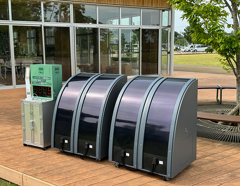 | 実証内容 | フィルム型ペロブスカイト太陽電池モジュールで発電した電力を用いて、5Vの出力を行い、タブレットなどを稼働させる検証を行う。 |