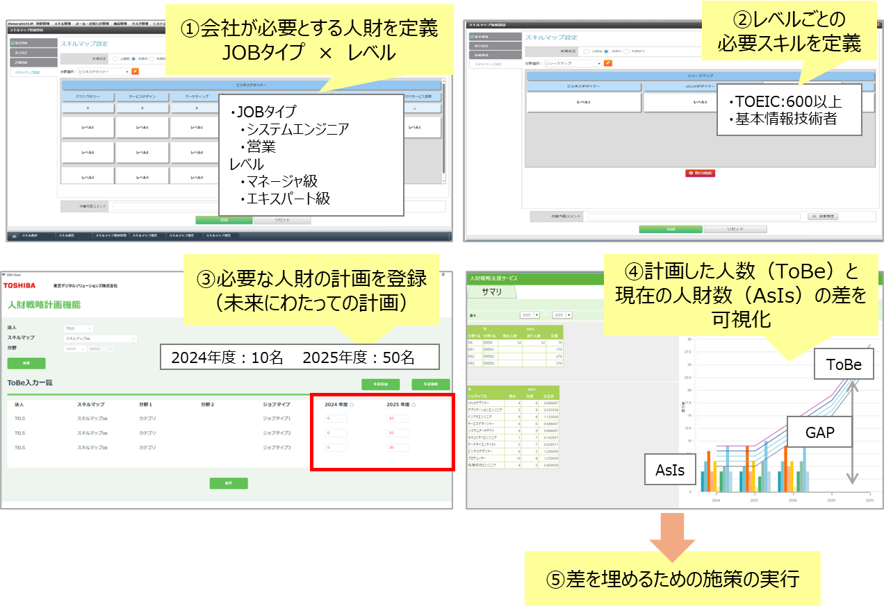 ①会社が必要とする人財を、JOBタイプやレベルによって定義 ②レベルごとに必要なスキルを定義 ③必要な人財の計画を登録(未来にわたっての計画) ④現在の人財数(As-Is)と計画した人数(ToBe)の差を可視化 ⑤可視化された「GAP」を埋めるための施策を実行