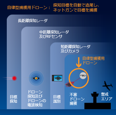 自律型捕獲用ドローンにはレーダを搭載。射程圏内まで目標ドローンを自動で追尾します。
