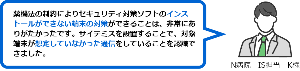 リプレースや更新が難しい医療分野のレガシー機器や、IT分野の特殊な研究装置、開発環境のOSのセキュリティ問題、ウイルス対策ソフトが導入できない問題など、IoT/DX化の流れに取り残されて、ネットワークにつなげられない、つなげていても心配といったセキュリティ課題があります。リモート監視・操作に関しても、セキュリティの心配からなかなか導入が進まないという課題もあります。CYTHEMIS™(サイテミス)デバイスをネットワークにつなぐだけで、これまでの手法では対応が難しかったセキュリティ課題を解決します。