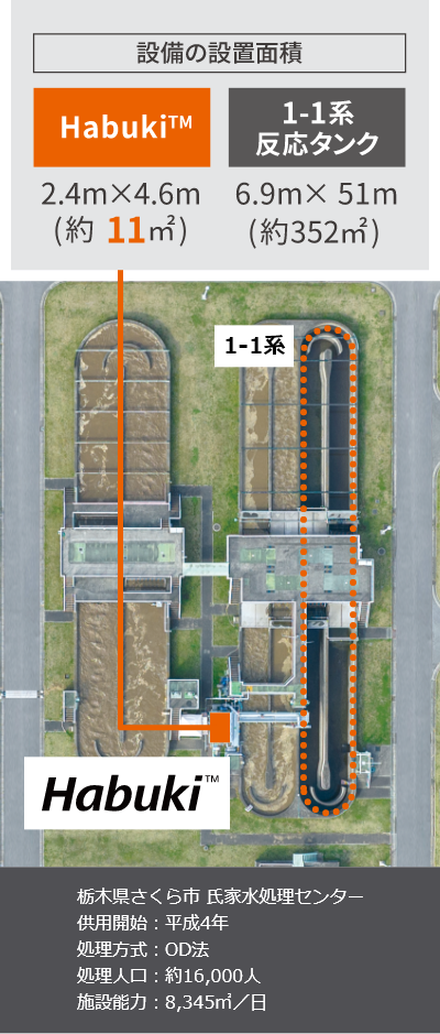 実証系列では、流入下水と返送汚泥がHabuki™装置内で混合し、処理された水と返送汚泥の混合液が既設の反応タンクに流入します。