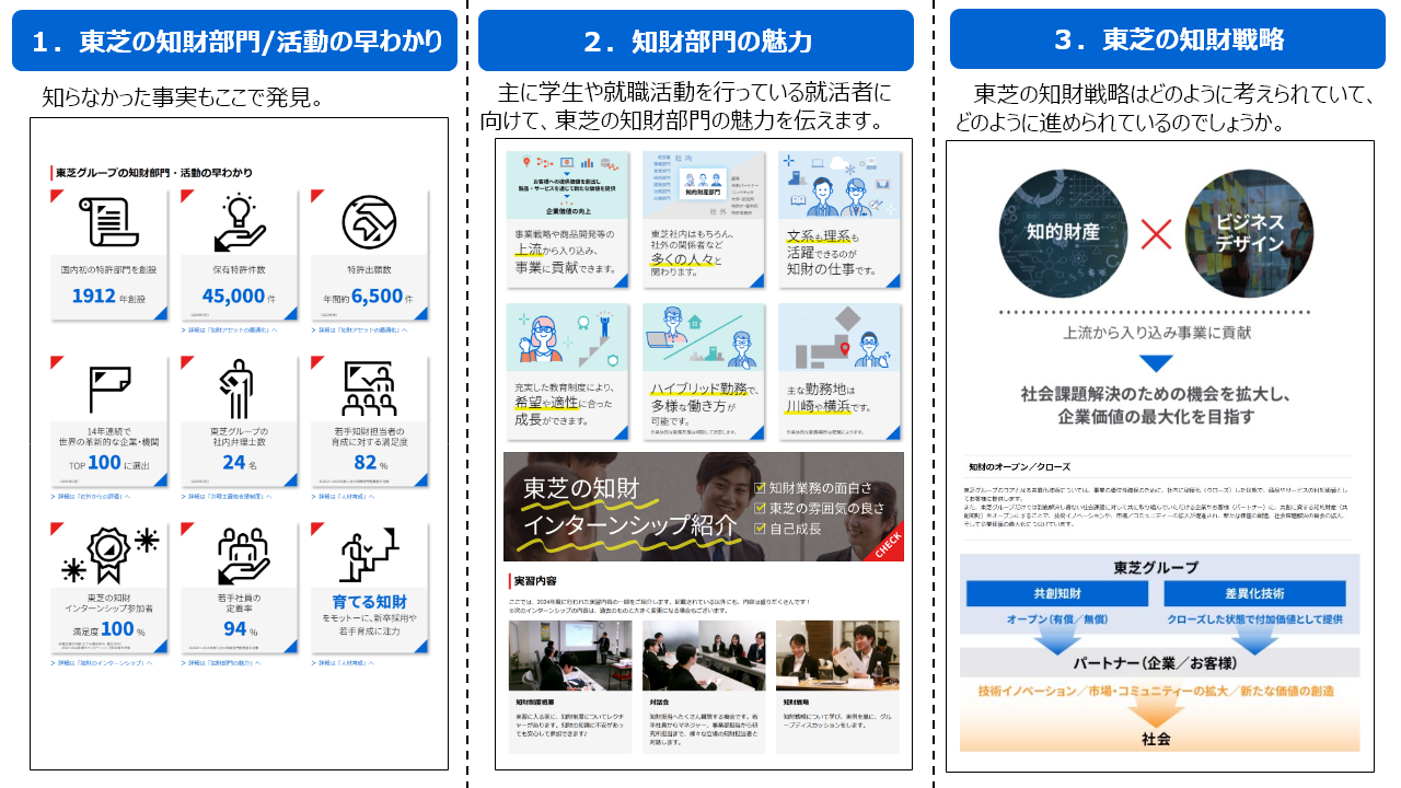 東芝グループの知的財産に関する活動を広く知ってもらい、共創を進めていきたい。また、就活者の皆様におかれては、東芝知的財産部門の魅力を知ってもらい、ここで働きたいと思ってもらいたい。このような想いから、ウェブサイトを公開しました(2024年4月26日より一般公開、2025年3月更新)。