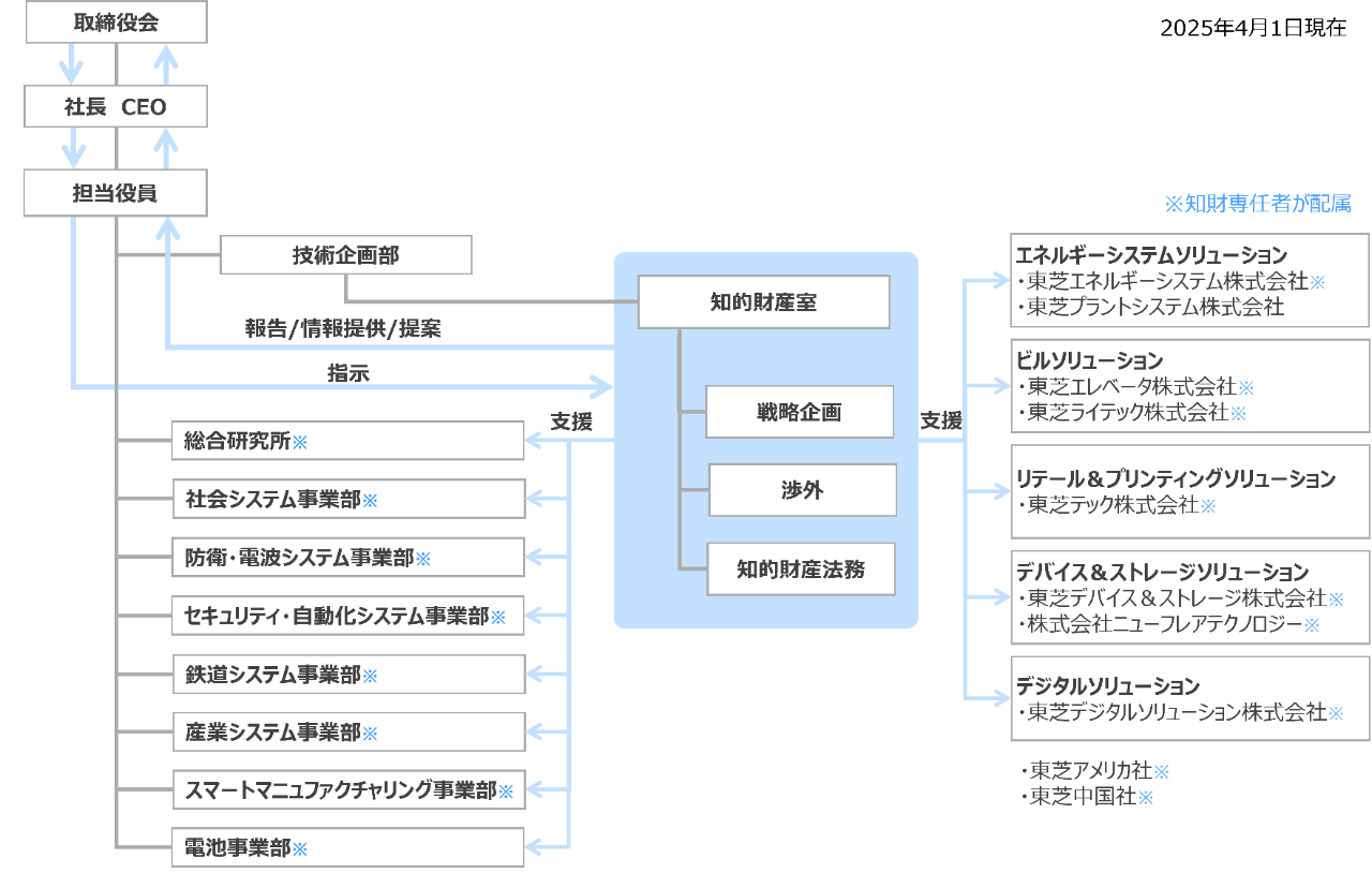 知的財産室の戦略企画部門、知的財産法務部門、渉外部門は、経営戦略や事業戦略、外部の環境変化、知的資産など全体を俯瞰した知財戦略の立案や、法改正などの情報をいち早く収集して東芝グループを横断した知財方針の制定、特許情報などの分析に基づく情報提供や提言を行っています。また、「著作権法」や「不正競争防止法」を含めた知財関連のコンプライアンス対応や知財教育、事業優位性の確保やリスクを予測した契約・係争対応を行っています。