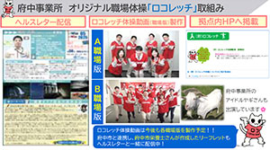 府中事業所では、地域とともに健康づくりに取り組むために、ロコモシンドローム・転倒災害予防も兼ねた職場体操の「ロコレッチ」を府中市と連携して考案しました。10時と15時の定期的に構内放送で体操音楽を流すことで、職場に居ながら定期的な運動ができる環境づくりを進めています。