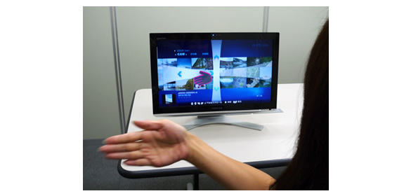 ストレスフリー手追跡技術と連続ジェスチャ判定技術を利用して、上下左右の手振り、握り、バイバイの各ジェスチャを高精度に認識することが可能になりました。そして、各ジェスチャをそれぞれ十字キー操作、決定、キャンセルの基本操作に割り当て、直感的で疲労感の少ないストレスフリーなハンドジェスチャ操作を実現しました。直接手を触れずに電子機器の操作が可能です。将来的には、テレビやエアコンなどの家電機器の操作やデジタルサイネージへの応用などが期待できます。