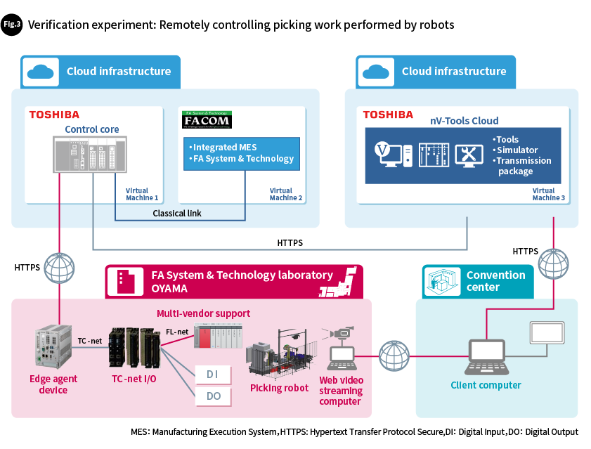 First, let's look at the usage example of FA System & Technology Corporation. This company has conducted demonstrations in which it controls factory equipment remotely, from a convention center. In the company's system configuration, Cloud based PLC is connected to the company's cloud-based MES, and the two share data. FA System & Technology succeeded at connecting from the convention center to Cloud based PLC, controlling the robots in the smart factory and having them perform bulk picking, and displaying equipment operating status in real time on the MES (Fig. 3). The company also performed a digital twin verification demonstration in which a cloud-based simulator was used to coordinate between a robot and a conveyor belt, operating them in real time.