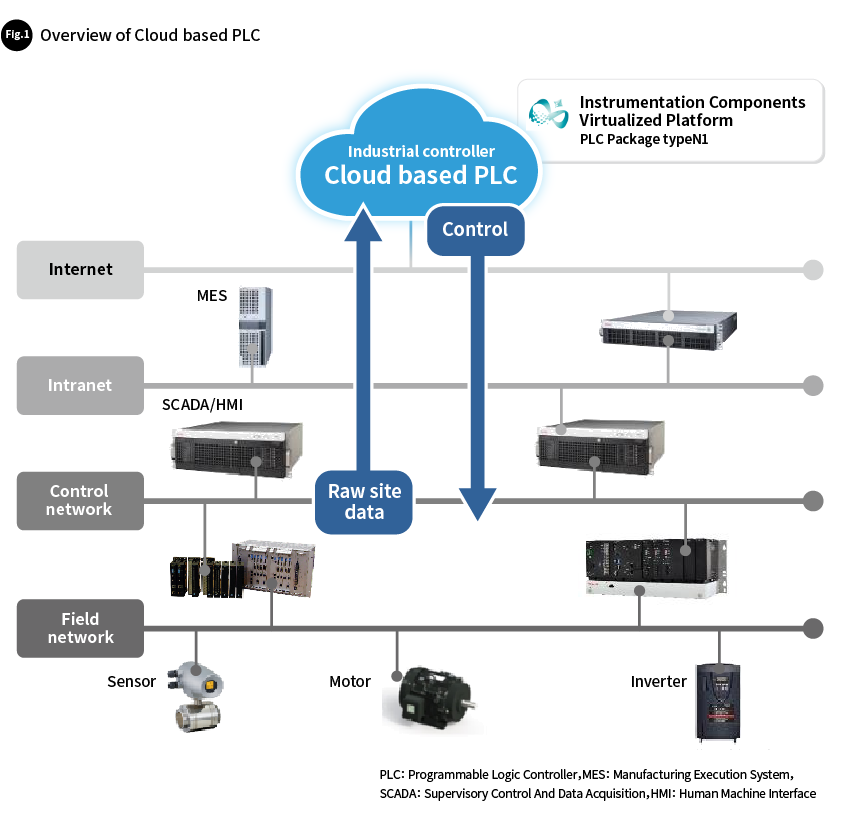 These controllers are constantly evolving with the times. This evolution includes device integration and performance improvements, efficiency improvements, space reductions, wiring reductions, deployment and operation cost reductions, compliance with international standards, and the use of open designs that make it easy for them to be connected to and used with devices from various manufacturers. In 2007, we developed the nv series of unified controllers. These controllers integrate controllers, which had previously differed from industry to industry, with input and output (I/O) systems. In 2019, we developed the Vm series of unified controllers, which use software to provide the control functions that had previously been handled by hardware (making them software-defined devices). These controllers were implemented using general purpose architecture, which enabled them to be linked with computer functions. Now, we have launched a service that implements their control cores, the parts that provide their control functions, in the cloud. This service is called Instrumentation Components Virtualized Platform PLC Package typeN1 (hereinafter referred to as “Cloud based PLC”) (Fig. 1).