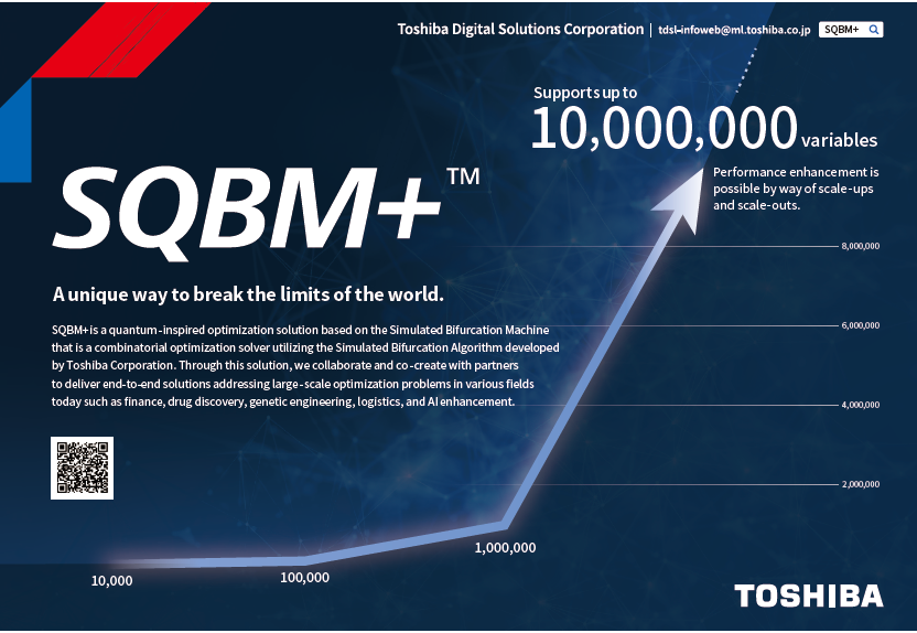 Inspired by quantum technology, SQBM+ is an optimization solution derived from the Simulated Bifurcation Machine, a combinatorial optimization solver built on the Simulated Bifurcation Algorithm developed by Toshiba Corporation. Through collaborations and co-creation with expert partners, we are contributing to solutions to deeply complex problems in areas as diverse as finance, drug discovery, genetic engineering, logistics, and AI enhancement.