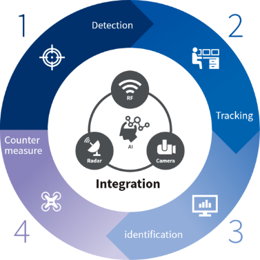 Radars cover short-medium range and the RF sensor receives radio waves from drones. These quickly detect the arrival of suspicious targets.