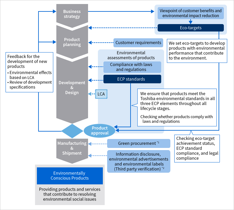 Specifically, we aim to reduce the environmental impacts of our products and services through a process that incorporates environmental considerations from the business strategy stage by focusing on the three elements of ECP* (Toshiba Environmental Standards): mitigation of climate change, efficient use of resources, and management of chemicals.